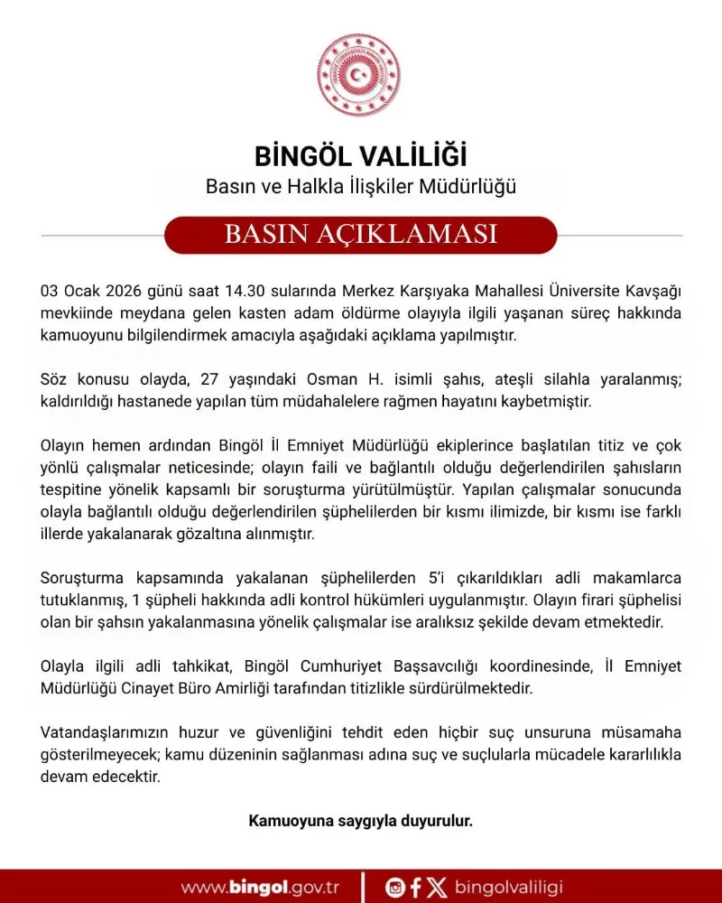 Bingöl Valiliği’nden yapılan açıklamada, "03 Ocak 2026 günü saat 14.30 sularında merkez Karşıyaka Mahallesi Üniversite Kavşağı mevkiinde meydana gelen kasten adam öldürme olayıyla ilgili yaşanan süreç hakkında kamuoyunu bilgilendirmek amacıyla aşağıdaki açıklama yapılmıştır. Söz konusu olayda, 27 yaşındaki Osman H. isimli şahıs, ateşli silahla yaralanmış; kaldırıldığı hastanede yapılan tüm müdahalelere rağmen hayatını kaybetmiştir. Olayın hemen ardından Bingöl İl Emniyet Müdürlüğü ekiplerince başlatılan titiz ve çok yönlü çalışmalar neticesinde; olayın faili ve bağlantılı olduğu değerlendirilen şahısların tespitine yönelik kapsamlı bir soruşturma yürütülmüştür. Yapılan çalışmalar sonucunda olayla bağlantılı olduğu değerlendirilen şüphelilerden bir kısmı ilimizde, bir kısmı ise farklı illerde yakalanarak gözaltına alınmıştır. Soruşturma kapsamında yakalanan şüphelilerden 5'i çıkarıldıkları adli makamlarca tutuklanmış, 1 şüpheli hakkında adli kontrol hükümleri uygulanmıştır. Olayın firari şüphelisi olan bir şahsın yakalanmasına yönelik çalışmalar ise aralıksız şekilde devam etmektedir. Olayla ilgili adli tahkikat, Bingöl Cumhuriyet Başsavcılığı koordinesinde, İl Emniyet Müdürlüğü Cinayet Büro Amirliği tarafından titizlikle sürdürülmektedir" denildi.