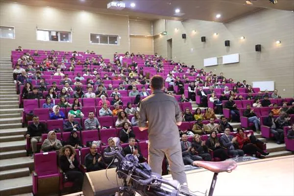 Bisikletiyle dünyayı gezen "Demir atlı adam" lakaplı gezgin Gürkan Genç, Bartın'da üniversite öğrencileriyle bir araya geldi.