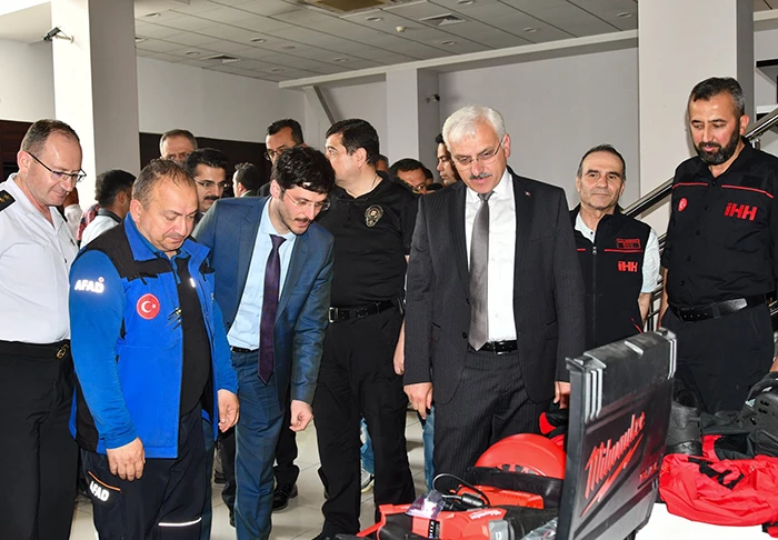 Törenden sonra Vali Kılıç ve protokol üyeleri, SAK'ın aldığı hibe sonucu derneğe kazandırdığı arama kurtarma malzemelerini inceleyerek yetkililerden bilgi aldı.