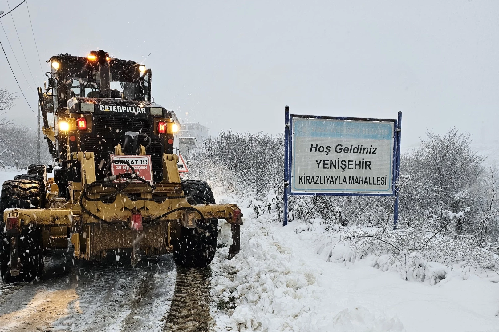 Bursa genelinde 585 araç ve iş makinesinin yanı sıra toplam bin 155 personelle kar mesaisi yapan Büyükşehir Belediyesi, yol açma çalışmalarına 24 saat boyunca kesintisiz devam ediyor.