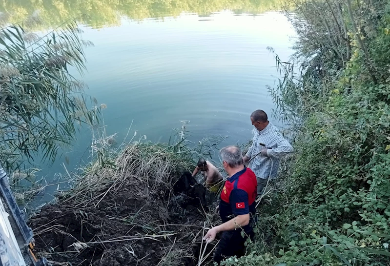 İtfaiye personeli iş makinesine bağlı ipe ineği bağlayarak kıyıya çıkardı. İnek sahibine teslim edildi.