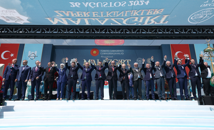 Cumhurbaşkanı Erdoğan, "Bir cuma sabahı, semaya karşı, Malazgirt'te 54 bin er, bestelediler en güzel marşı: Allahu ekber, Allahu ekber." dizelerine atıfta bulunarak "Bu mısralara ilham veren o günkü imanla o günkü cesaretle o günkü adanmışlıkla bugün yine Malazgirt'teyiz." dedi.