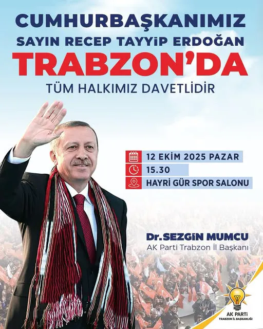 Cumhurbaşkanı Recep Tayyip Erdoğan, 12 Ekim 2025 Pazar günü Trabzon’da halkla bir araya gelecek. AK Parti Trabzon İl Başkanlığı tarafından yapılan açıklamaya göre, etkinlik tüm halkın katılımına açık olacak.