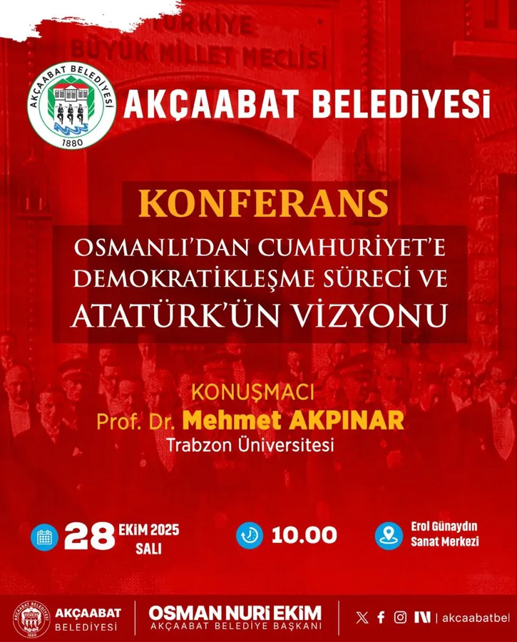 Tarihsel bir perspektifle Cumhuriyetin temellerine ışık tutacak konferans, “Osmanlı’dan Cumhuriyet’e Demokratikleşme Süreci ve Atatürk’ün Vizyonu” başlığıyla gerçekleştirilecek. Konuşmacı olarak Trabzon Üniversitesi Öğretim Üyesi Prof. Dr. Mehmet Akpınar'ın katılacağı programda, Osmanlı'dan Cumhuriyet'e uzanan demokratikleşme süreci ve Gazi Mustafa Kemal Atatürk’ün çağının ötesindeki vizyonu ele alınacak.