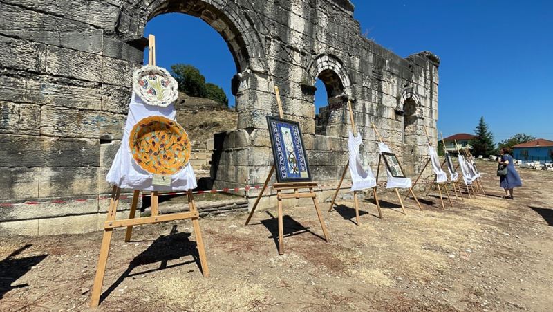 Çini sanatçısı Harun Agah Altay, "1-8 Ağustos Dünya Düzce Günleri" etkinlikleri kapsamında tarihi Konuralp bölgesinde yer alan antik kentte izlenime sunulan sergide, kazı çalışmalarında çıkan eserlerin figür ve motiflerini çini sanatıyla buluşturdu.