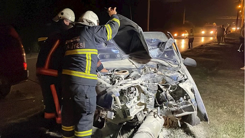 DÜZCE (AA) - Düzce'de aydınlatma direğine çarptıktan sonra ön kısmı alev alan otomobilin sürücüsü yaralandı.