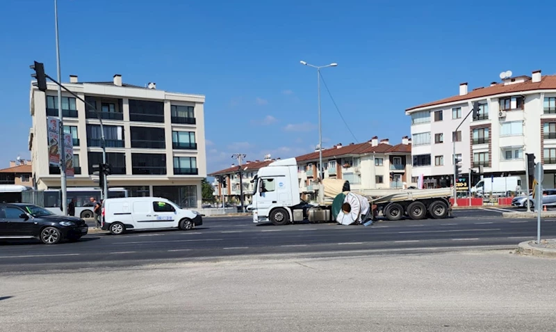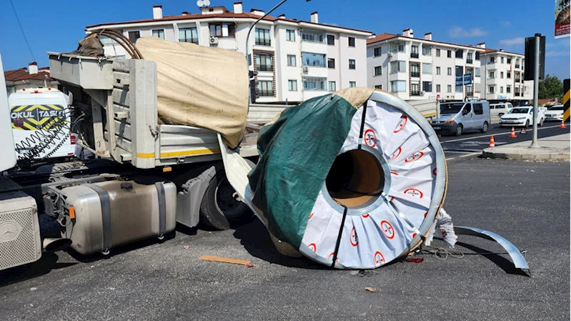 Çarpmanın etkisiyle tırın kasasındaki yaklaşık 5 ton ağırlığındaki sac, yola devrildi.