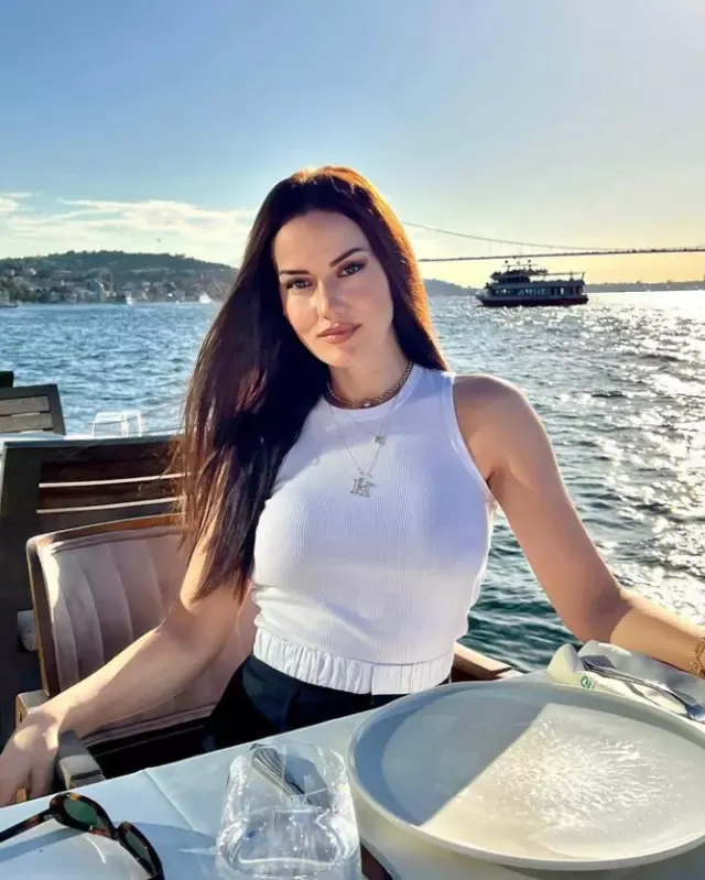 Güzelliği ile adeta büyüleyen Fahriye Evcen bu sefer de boğazda gittiği bir restoranda poz verdi. Ünlü ismin paylaşımında boynundaki kolyesi dikkat çekti.