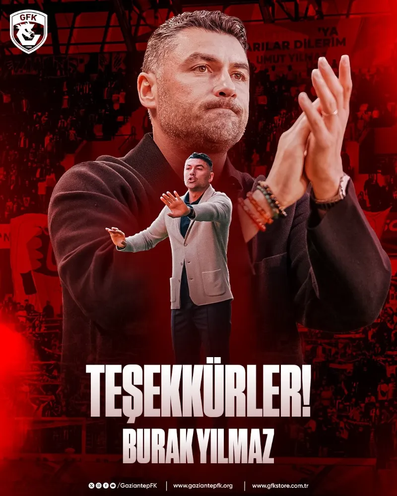 Gaziantep FK Kulübü'nden konuya ilişkin yapılan açıklamada, "Dün oynanan Göztepe karşılaşması sonrası iki maç sonra görevi bırakacağını açıklayan Teknik Direktörümüz Burak Yılmaz, bugün aldığı karar doğrultusunda şu anda bırakmanın daha doğru olacağını ifade ederek istifa etmiştir. Teknik Direktörümüz Burak Yılmaz ve ekibine emekleri için teşekkür eder, bundan sonraki kariyerlerinde başarılar dileriz" ifadelerine yer verildi.
