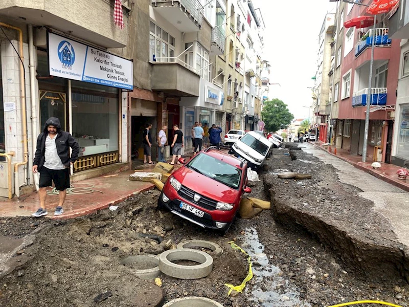 Yaklaşık 40 santimetre çöken yolda park halindeki araçlar zarar gördü.