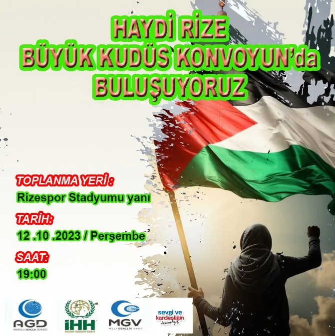 Rize Anadolu Gençlik Derneği (AGD),Rize İnsani yardım Vakfı (İHH) ve Rize Milli Gençlik Vakfının (MGV) düzenlediği “Büyük Kudüs Konvoyu” etkinliği gerçekleştirecek.