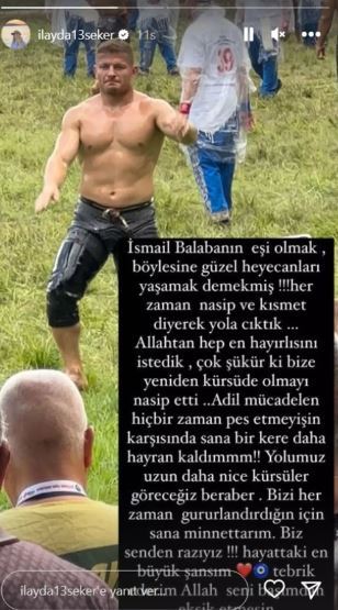Survivor'da tanışıp evlendiği eşi İlayda Şeker pehlivan eşini yere göre sığdıramadı. "Aslan kocam benim" diyerek paylaşım yapan Survivor İlayda "İsmail Balaban'ın eşi olmak böylesine güzel heyecanları yaşamak demekmiş... Her zaman nasip ve kısmet diyerek yola çıktık. Allah'tan hep en hayırlısını istedik. Adil mücadelen hiçbir zaman pes etmeyişin karşısında sana bir kere daha hayran kaldım" dedi.
