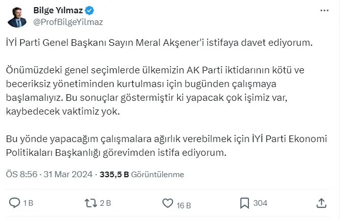 Açıklamada, "Bu yönde yapacağım çalışmalara ağırlık verebilmek için İYİ Parti Ekonomi Politikaları Başkanlığı görevimden istifa ediyorum. Sayın Meral Akşener'i de bu vesileyle kongreye giderek partimizi yenilemeye ve önümüzdeki seçimlere güçlü bir şekilde girmeye davet ediyorum" ifadelerine yer verdi.