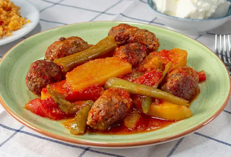 Orta boy bir fırın tepsisini patates ve köfteleri sırayla yerleştirin. Biberleri ve domatesleri de iri parçalar halinde tepsinin boşluklarına veya aralarına yerleştirin. Hazırladığınız sosu tepsideki tüm malzemelerin üstüne dökün.
