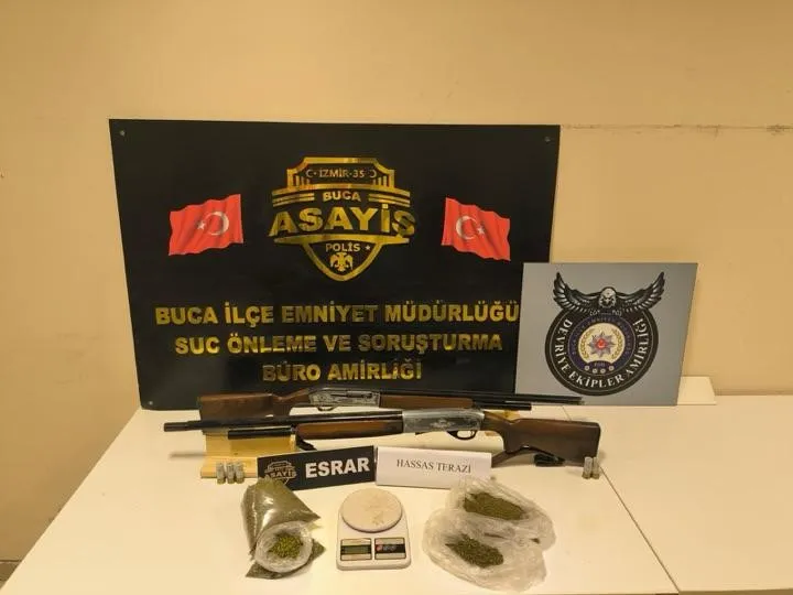 Edinilen bilgiye göre, Buca İlçe Emniyet Müdürlüğü ekipleri, uyuşturucu madde ticaretini önlemeye yönelik çalışmalarını sürdürüyor. Polis ekipleri tarafından Buca ve Gaziemir ilçeleri sınırında gerçekleştirilen operasyon kapsamında C.Ç. isimli şüpheli yakalandı. Şüphelinin ikametinde yapılan aramalarda 468 gram esrar maddesi, 2 adet ruhsatsız tüfek ve 1 adet hassas terazi ele geçirildi. Gözaltına alınan şüpheli C.Ç., emniyetteki işlemlerinin ardından adli mercilere sevk edildi.