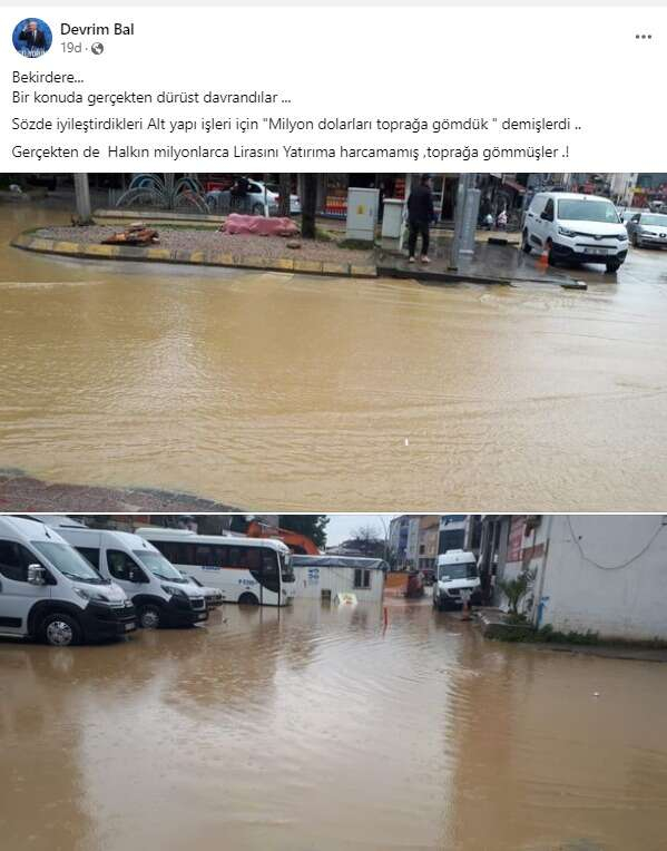 İzmit Belediyesi CHP Meclis Üyesi Devrim Bal, altyapının yetersiz kaldığı yollar ile ilgili olarak sosyal medyadan açıklama yaptı. Büyükşehir’in sorumluluğundaki alt yapının yetersiz kaldığını işaret eden Devrim Bal, “Bekirdere... Bir konuda gerçekten dürüst davrandılar. Sözde iyileştirdikleri alt yapı işleri için 'Milyon dolarları toprağa gömdük' demişlerdi. Gerçekten de halkın milyonlarca lirasını yatırıma harcamamış, toprağa gömmüşler” ifadelerine yer verdi.