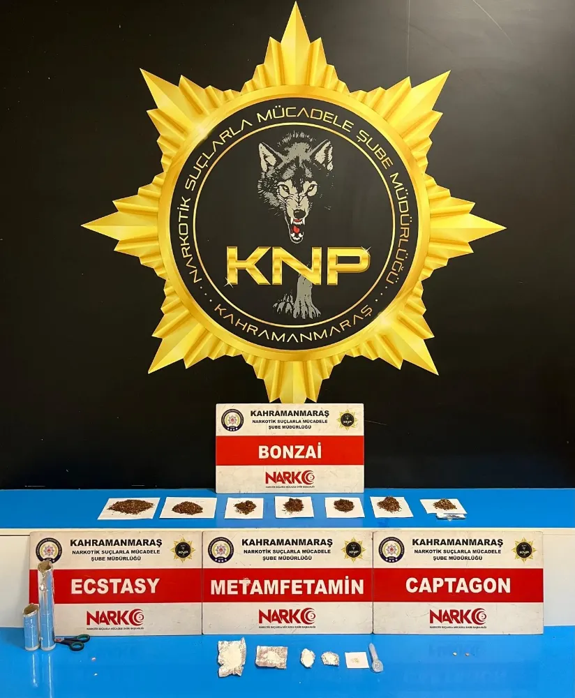 Kahramanmaraş Emniyeti, Narkotik Suçlarla Mücadele ekiplerinin düzenlediği operasyonda, 32 sentetik ecza, 57,29 gram bonzai, 3 sentetik hap ve 14 gram metamfetamin ele geçirdi.