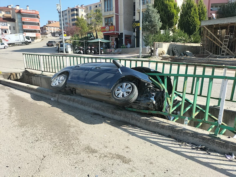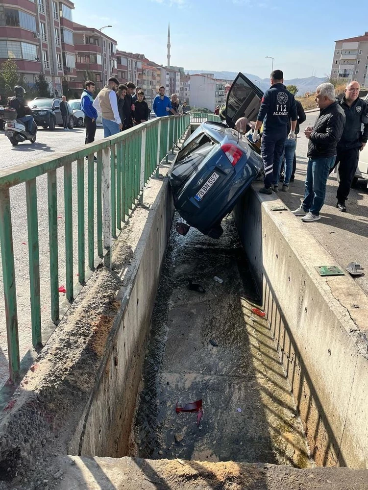 100. Yıl Mahallesi 1002 No'lu Caddesi'nde, K. B. (38) idaresindeki 78 BN 557 plakalı otomobil, sürücüsünün direksiyon hakimiyetini kaybetmesi sonucu demir korkuluklara çapmasının ardından su kanalında asılı kaldı.