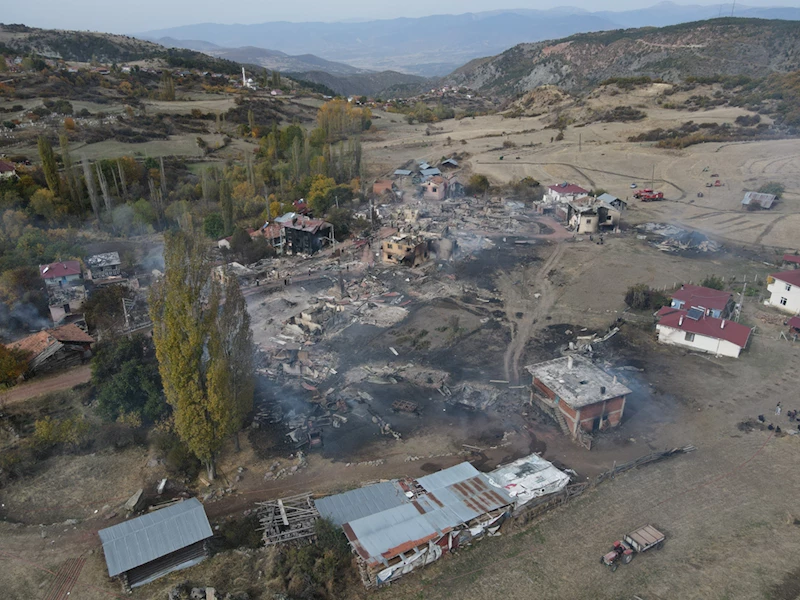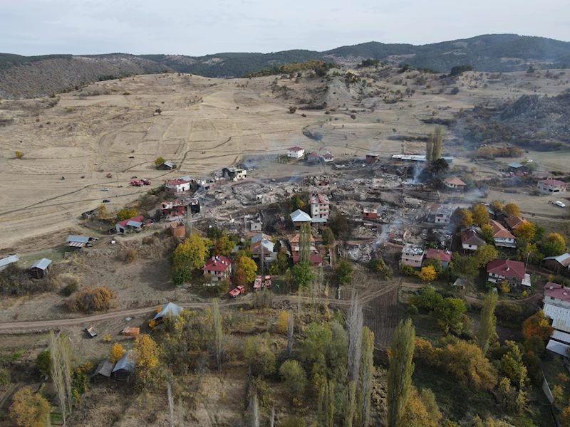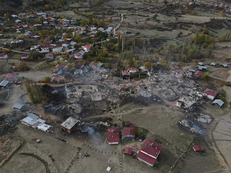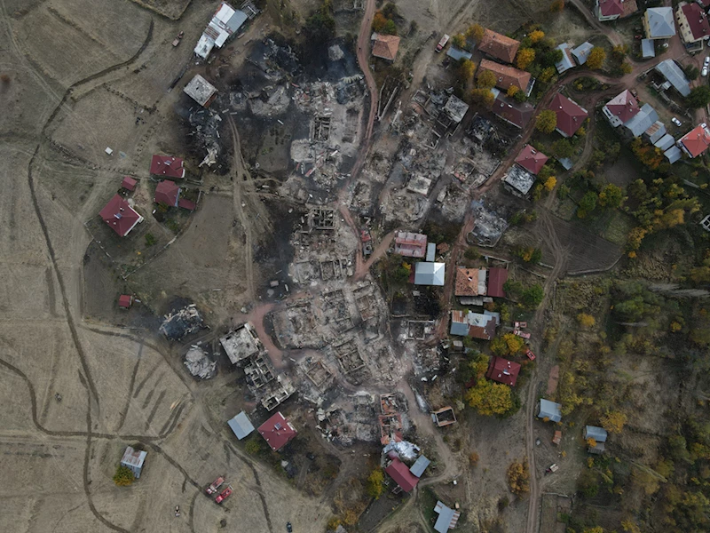 Evlerin yanı sıra büyük ve küçükbaş hayvanlar ile tarım aletlerinin de zarar gördüğü yangını AA ekibi dronla görüntüledi.