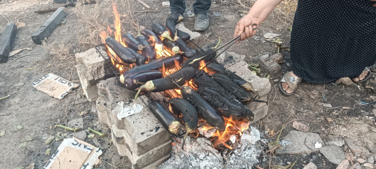 Mardin'de sofraların vazgeçilmez lezzeti babaganuç hazırlığına başlayan kadınlar, 47 dereceyi bulan sıcaklarda ateşte patlıcan közlüyor.