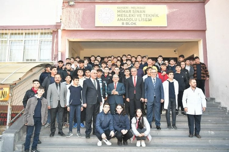 Okul girişinde İl Milli Eğitim Müdürü Ayhan Teltik ve Melikgazi İlçe Milli Eğitim Müdürü Hacı Kaya ile okul yönetimi ve öğrenciler tarafından karşılanan Başkan Büyükkılıç, burada öğrencilerin alkış ve sevgi gösterileriyle karşılaştı.