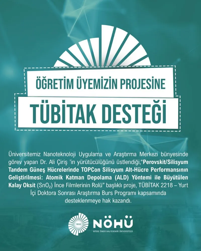 "Perovskit/Silisyum Tandem Güneş Hücrelerinde TOPCon Silisyum Alt-Hücre Performansının Geliştirilmesi: Atomik Katman Depolama (ALD) Yöntemi ile Büyütülen Kalay Oksit (SnO) İnce Filmlerinin Rolü" başlıklı proje, güneş enerjisi teknolojileri alanında yenilikçi çalışmalar yürütmeyi hedefliyor.