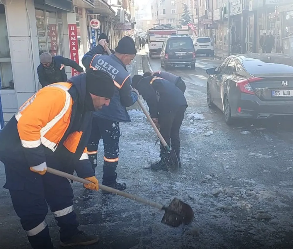 Oltu Belediyesi ekipleri, kış aylarında vatandaşların güvenliği için kar ve buz temizleme çalışmalarını aralıksız sürdürüyor. Çatılardan düşen karların kaldırımlarda oluşturduğu kar birikintileri ve buzlanmalar, ekiplerin yoğun mesaisiyle günlük olarak farklı noktalarda temizleniyor.