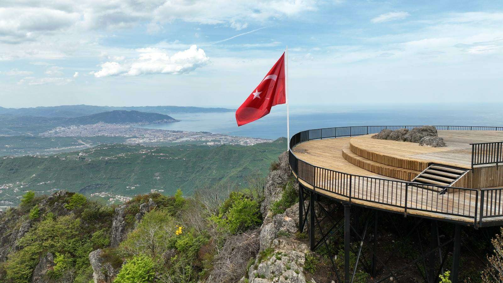 Ordu Büyükşehir Belediyesinin yürüyüş basamaklarının yenilenmesi, zirveye yakın bir alana kadar ulaşım sağlayan ve acil durumlar dışında araç trafiğine kapalı bisiklet yolu, at safari pistleri ve yürüyüş parkuru üzerine oturma bankları ile piknik masası yerleştirme çalışmalarını tamamladığı Yoroz’da, son işlem olarak zirve noktasına seyir terası yapımı da son aşamaya geldi. Ekiplerin hummalı bir çalışma yürüterek sona geldiği seyir terasına dev bir Türk bayrağı asıldı. Yoroz’a yapılan çalışmalarla bölge yeni bir kimlik kazanırken, zirveden izlenen manzara ise mest ediyor.