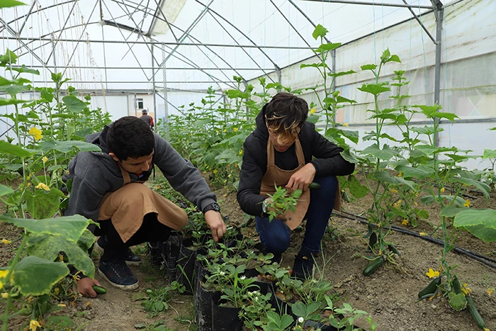 Çocuklar ve gençler, ziraat mühendisleri ve öğretmenleri eşliğinde hem sebze ve meyve üretiyor hem de seraların bakımlarını yapıyor.