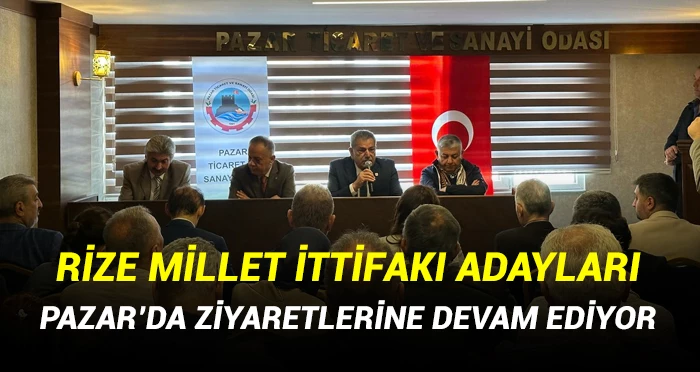Rize Millet İttifakı Milletvekili adayları, Sarıyer Belediye Başkanı Şükrü Genç, Fındıklı Belediye Başkanı Ercüment Çervatoğlu ve CHP Kadın Kolları Genel Başkan Yardımcısı Necla Kaçan ile birlikte, Pazar ilçesindeki ziyaretlerine devam etti. Ticaret ve Sanayi Odası, Esnaf Odası, Ziraat Odası, Şoförler Odası ve Muhtarlar Derneği'ni ziyaret eden heyet, kurumların başkanları ve üyeleri tarafından sıcak bir şekilde karşılandı.