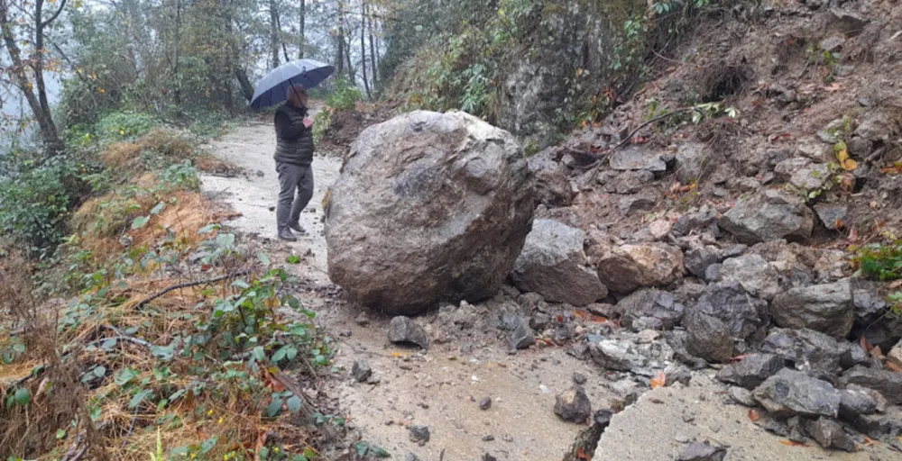 Beldedeki yamaçta, yağmur nedeniyle kayma meydana geldi. Kaymanın ardından kopan dev kaya parçası, Maden mahallesindeki yolu tamamen kapattı.