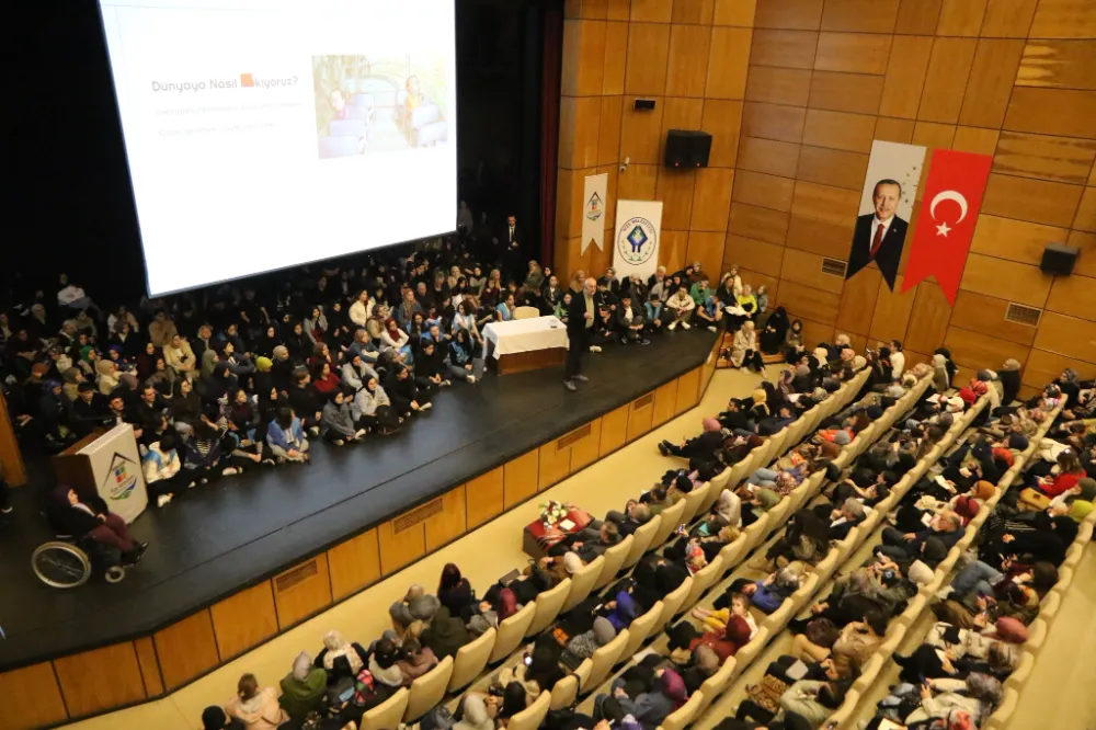 Prof. Dr. Kemal Sayar, yoğun ilgi gören konferansta, mutlu ve huzurlu bir yaşam için dikkat edilmesi gereken unsurları görsel sunum eşliğinde aktardı. Sayar, hayatın zorluklarına karşı mücadele etmenin, dayanışma içinde olmanın, her nefesin kıymetini bilerek şükretmenin, dostlarla küs kalmamanın, aile bağlarını güçlendirmenin ve iyilik yapmanın huzurun anahtarları olduğunu vurguladı. Mevlana Celaleddin-i Rumi’nin “Misafirhane” şiirini paylaşarak, dayanışma, özgüven, olaylara farklı bakış açıları geliştirme ve iyimserlik gibi değerlerin önemine dikkat çekti.