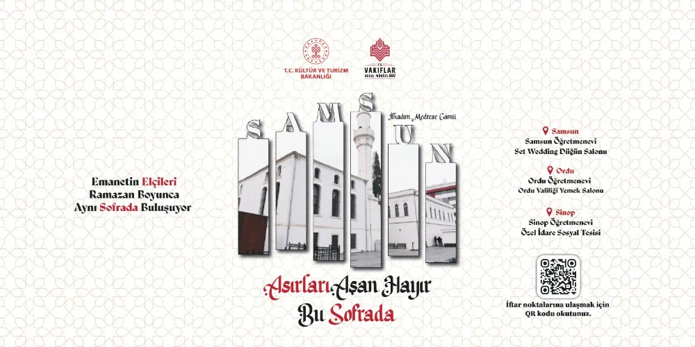 Kültür ve Turizm Bakanlığına bağlı olarak faaliyetlerini sürdüren Vakıflar Genel Müdürlüğü, "Asırları Aşan Hayır Bu Sofrada" temasıyla Ramazan ayı boyunca Türkiye genelinde ücretsiz iftar sofraları kuracak. Vakıflar Samsun Bölge Müdürlüğü koordinesinde Samsun, Ordu ve Sinop’ta belirlenen noktalarda binlerce vatandaş aynı sofrada buluşacak. Türkiye genelinde 25 Bölge Müdürlüğü aracılığıyla gerçekleştirilecek organizasyon kapsamında, ihtiyaç sahipleri başta olmak üzere vatandaşlara her gün ücretsiz iftar yemeği sunulacak.