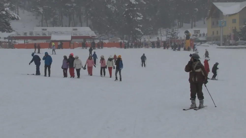 Sarıçam ormanları arasında "kristal kar" üzerinde kaymanın tadını çıkaran yerli ve yabancı turistler, kar yağışına aldırış etmeden pistleri doldurdu.