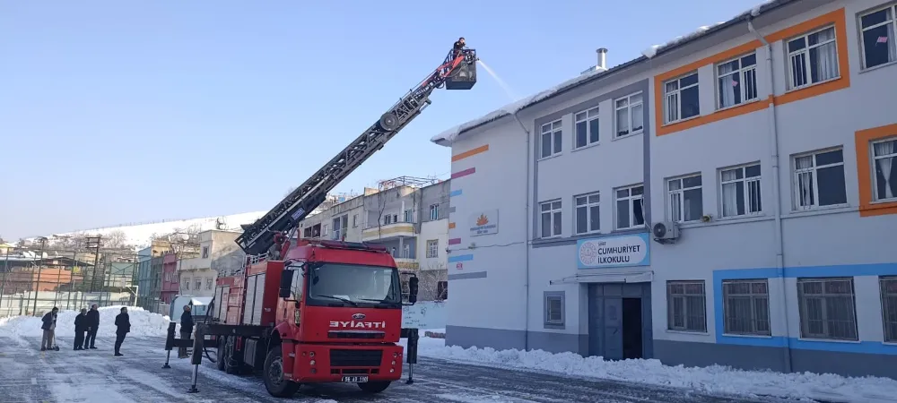 Siirt Belediyesi İtfaiye Müdürlüğü ekipleri, yaya ve araç trafiğinin yoğun olduğu cadde ve sokakların yanı sıra okul binaları başta olmak üzere kamu kurumlarında da önlem aldı. Çatılarda ve saçaklarda biriken kar kütleleri, merdivenli itfaiye araçları kullanılarak kontrollü şekilde temizleniyor.