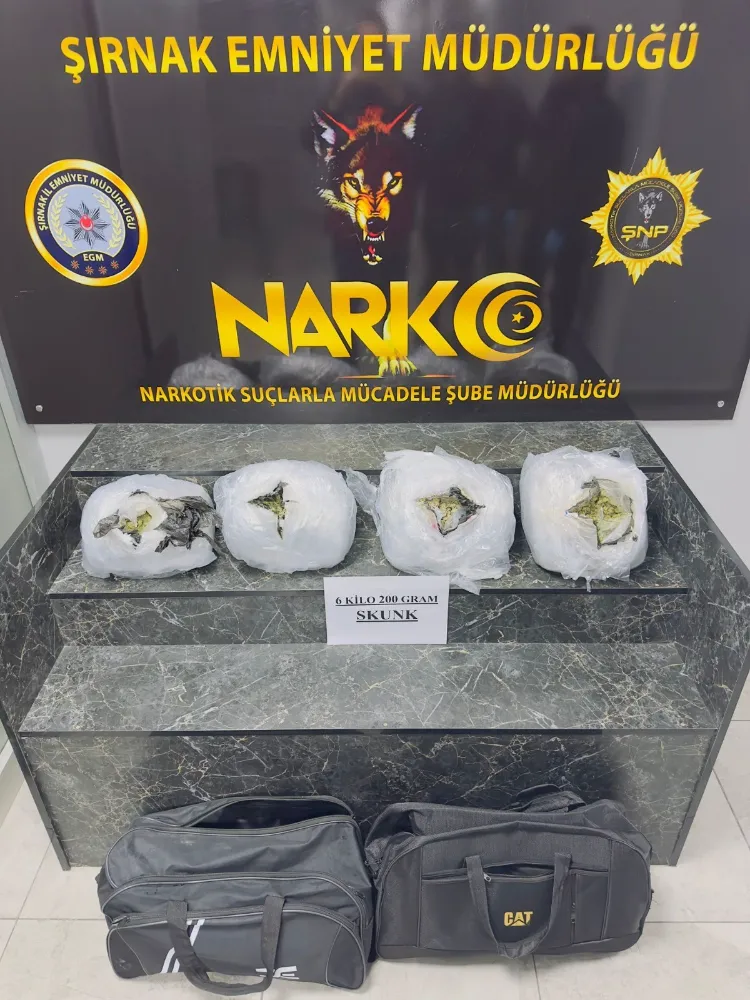 Şırnak İl Emniyet Müdürlüğü Narkotik Şube Müdürlüğü ekipleri tarafından uyuşturucu tacirlerine yönelik operasyonlar hız kesmeden devam ediyor. Bu çerçevede 2 şüpheli şahıs yapılan istihbarat ve teknik takip sonucu yakalanarak gözaltına alındı. Şüphelilere yönelik düzenlenen operasyonda, 6 kilo 200 gram skunk maddesi ele geçirildi. Ele geçirilen uyuşturucunun, yüzlerce genci zehirleyebilecek miktarda olduğu belirtildi.