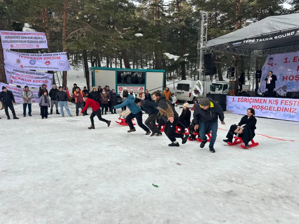 Eğriçimen Yaylası’nda düzenlenen kış festivalinde vatandaşlar, ekskavatöre bağlanan kızaklarla kayarak adrenalin yaşadı, halaylarla soğuk havada ısındı. Festival, geleneksel hale getirilmesi planlanıyor.
