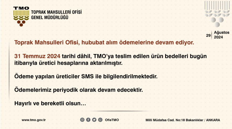 ANKARA (İGFA) - Toprak Mahsulleri Ofisi Genel Müdürlüğü'nden yapılan açıklamaya göre, 31 Temmuz 2024 tarihi dahil TMO'ya teslim edilen ürün bedellerinin bugün itibariyle üretici hesaplarına aktarıldığı duyuruldu.