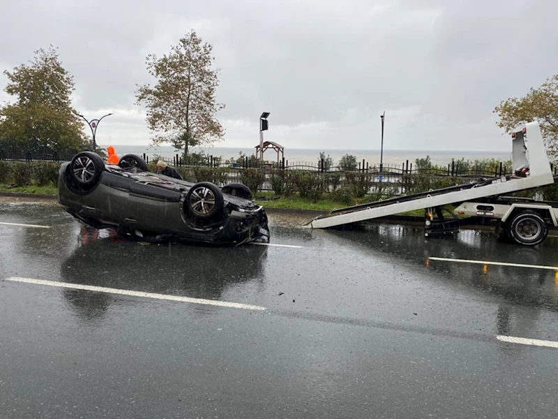 Trabzon'dan Of ilçesi istikametine giden Emin Tuğcu yönetimindeki 61 ACP 873 plakalı otomobil, Sürmene sahil geçişinde, yağmur nedeniyle kayganlaşan yolda refüje çıktı.