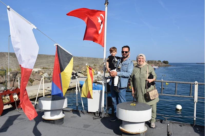 Botu ziyaret etmek için sabah saatlerinden itibaren çocuklarıyla Faroz Limanı'na gelen vatandaşlar, cep telefonlarıyla hatıra fotoğrafı çektirdi.