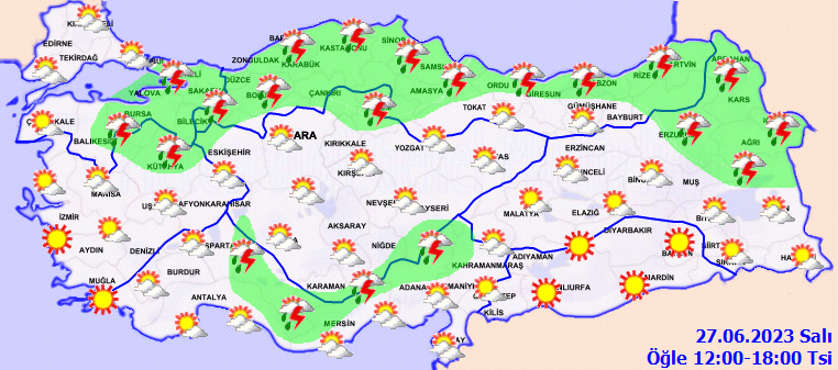 Kıyı kesimlerinin az bulutlu ve açık, iç kesimlerinin parçalı ve bulutlu, Kütahya çevrelerinin yerel olmak üzere sağanak ve gök gürültülü sağanak yağışlı geçeceği tahmin ediliyor.