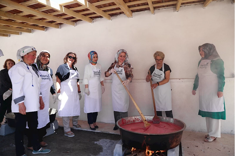 Vali Numan Hatipoğlu'nun eşi Ayfer Hatipoğlu, Tokatlı kadınlarla birlikte Tokat'ın meşhur ve lezzetli domateslerinden salça yaptı.