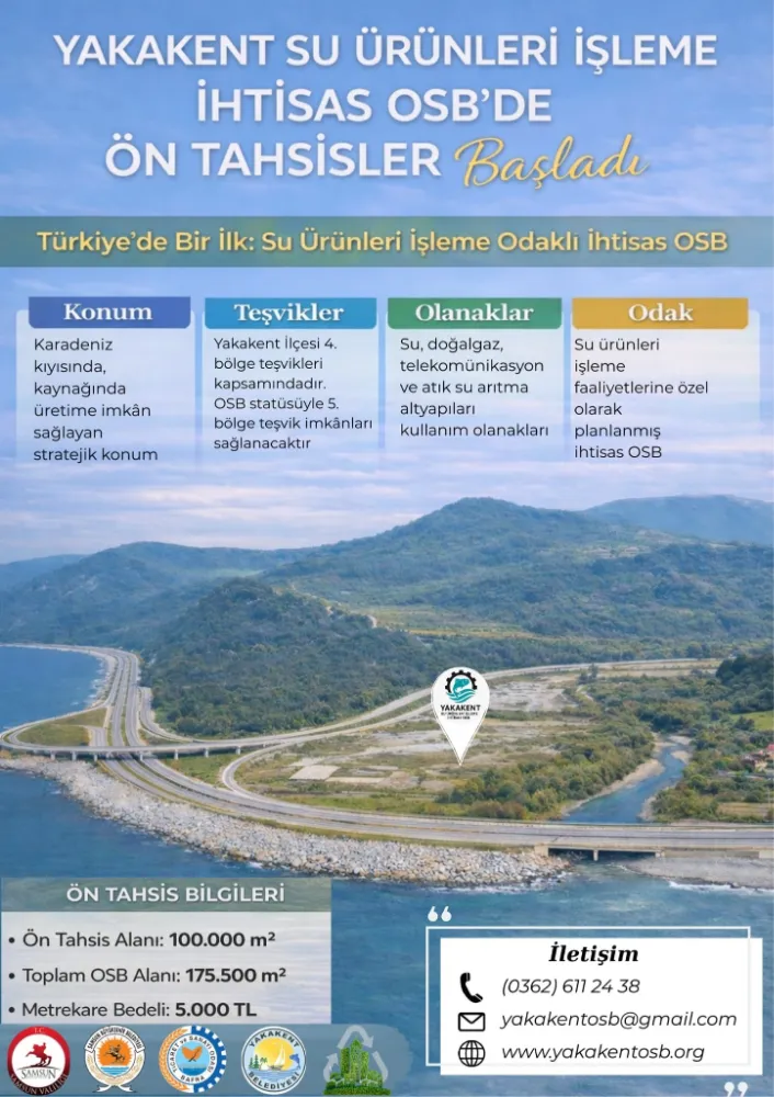 Samsun Valiliği koordinesinde yürütülen çalışmalar kapsamında, Türkiye’de su ürünleri işleme odaklı ilk ihtisas organize sanayi bölgesi olma özelliğini taşıyan Samsun Yakakent Su Ürünleri İşleme İhtisas Organize Sanayi Bölgesi'nde(OSB) Şubat ayı arsa tahsis süreci başladı.