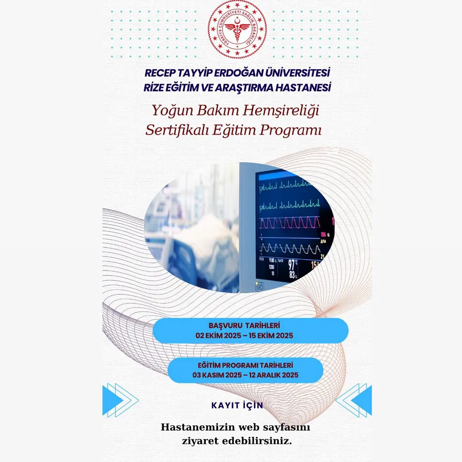 RTEÜ Eğitim ve Araştırma Hastanesi, sağlık personelinin mesleki gelişimini desteklemek amacıyla Yoğun Bakım Hemşireliği Sertifikalı Eğitim Programı düzenliyor. Program, 03 Kasım 2025 – 12 Aralık 2025 tarihleri arasında gerçekleştirilecek.